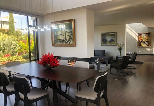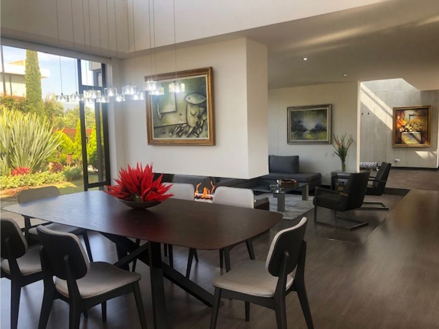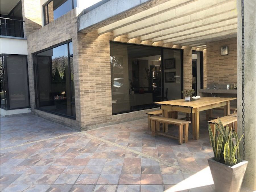 Conjunto en la Sabana de Bogotá con jardines, seguridad parques y zonas verdes, cerca de transporte público cercano a 5 minutos de la Autopista Norte. Dentro de lote de 1400 m2 y área construida de 474 m2. Cuenta con 4 habitaciones con baño privado y vestier cada una, en primer piso, sala de televisión, gran espacio de sala con chimenea y comedor integrados con cocina abierta moderna con torre de hornos. Lavador de platos y nevecón, independiente zona de lavandería, habitación y baño de servicio, depósitos en el piso 2.