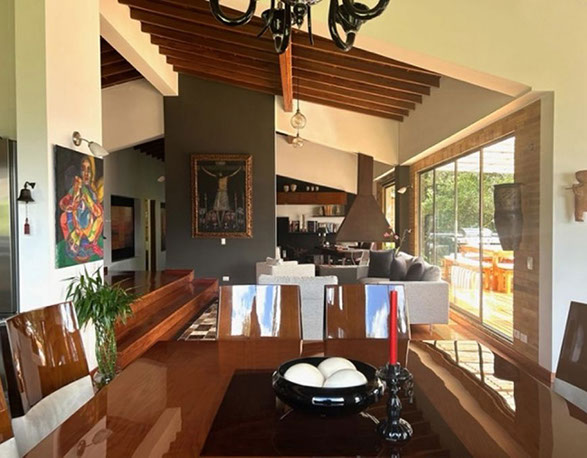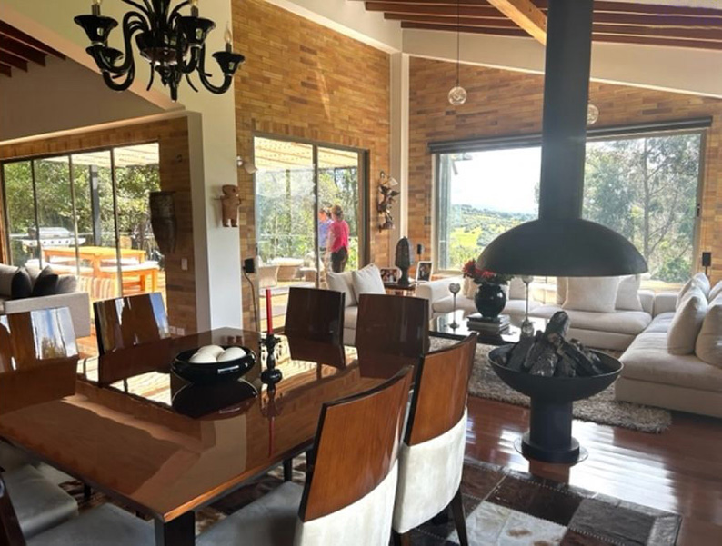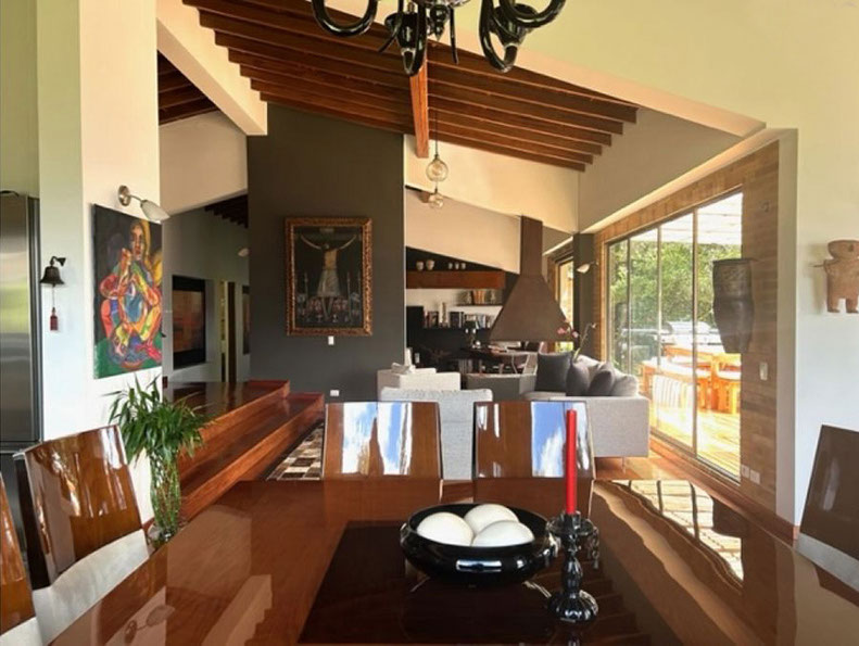 Vista a Sopó. Diseño exclusivo, dentro de área de lote de 2.200 m2 y 300 de área construida, distribuidos en un primer nivel con 80 m2 en el DECK, sala y comedor independientes, estudio o sala de televisión con chimenea. Cocina abierta con zona de servicios y puerta de acceso. 3 habitaciones, la principal con vestier, baño privado con jacuzzi y salida a la terraza, habitación adicional con baño y vestier. En piso hacia abajo encontramos una sala de juegos con chimenea y baño completo, depósito grande y 5 parqueaderos.