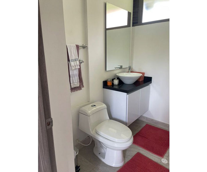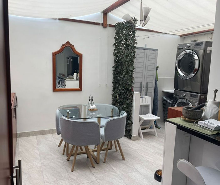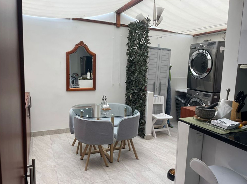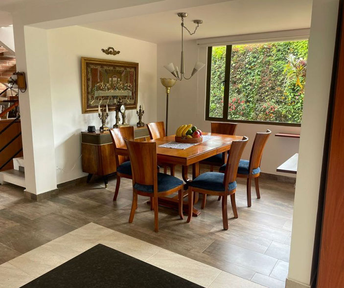 Vendo casa Chía vía Cota muy cerca de Andrés Carne de Res en conjunto cerrado, rodeado de árboles y naturaleza, con tanque de reserva de agua por hidroflow, y de aguas lluvias. Tiene un sendero para caminar y huerta comunal. La casa está completamente remodelada, iluminada, cálida con ventanería piso techo en sala, con área construida de 184 m2 (151 CDL) y tres niveles. El primer nivel consta de; sala con chimenea, comedor independiente, baño social, cocina abierta con barra, comedor auxiliar y zona de lavandería. En el segundo nivel; estudio con sala de televisión y balcón, 2 habitaciones una de ellas con altillo, que comparten un baño. En el tercer nivel; habitación principal con baño privado y 2 parqueaderos. Administración por conserjería.