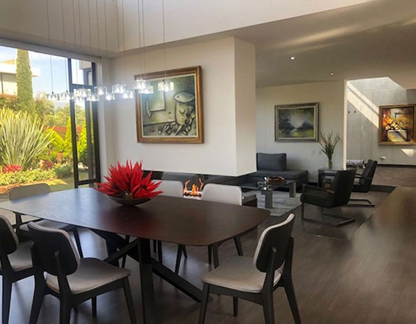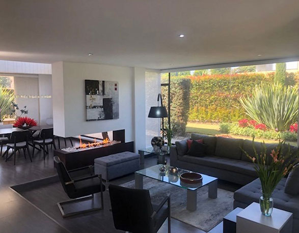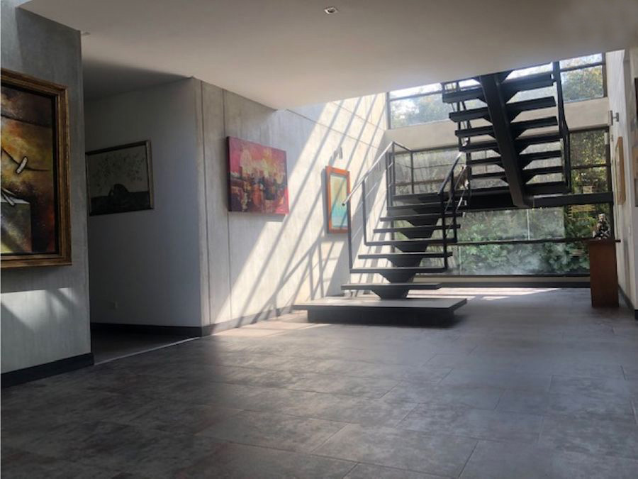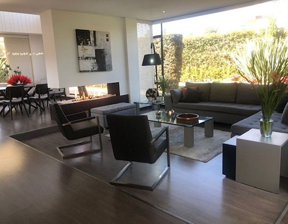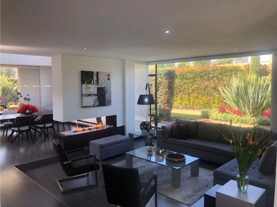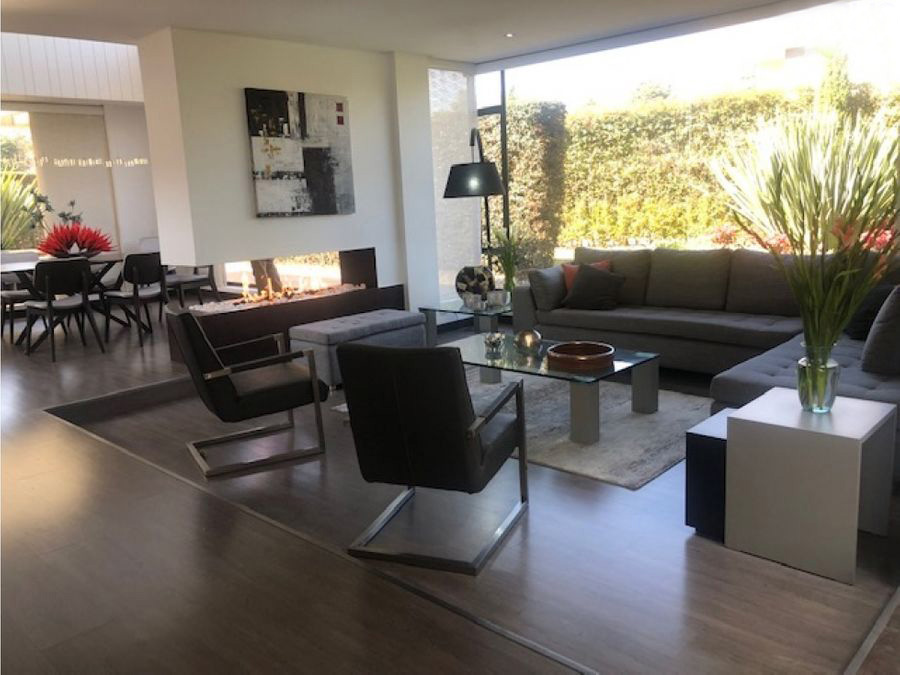 Conjunto en la Sabana de Bogotá con jardines, seguridad parques y zonas verdes, cerca de transporte público cercano a 5 minutos de la Autopista Norte. Dentro de lote de 1400 m2 y área construida de 474 m2. Cuenta con 4 habitaciones con baño privado y vestier cada una, en primer piso, sala de televisión, gran espacio de sala con chimenea y comedor integrados con cocina abierta moderna con torre de hornos. Lavador de platos y nevecón, independiente zona de lavandería, habitación y baño de servicio, depósitos en el piso 2.