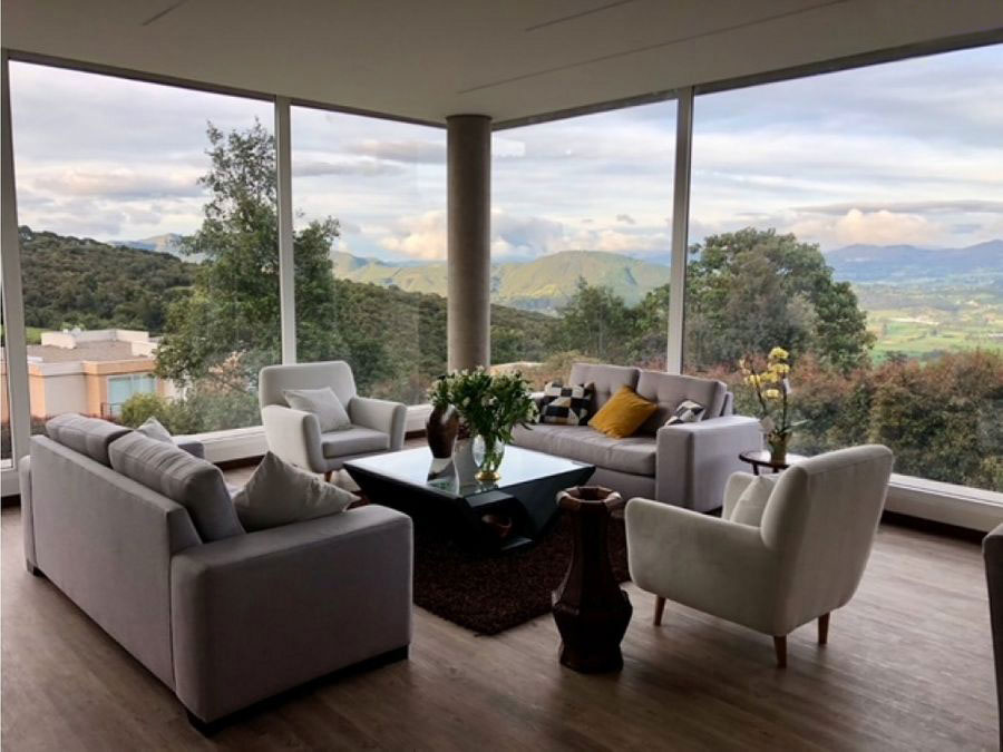 Por el placer de vivir con aire puro y la mejor vista a Sopó en Cundinamarca. La(o) invito a visitar esta excelente casa, dentro de Club House con senderos, piscina, canchas de juego, salón social, restaurante, y pesebreras. Goza de un área de terreno de 1840 y 453 m2 construidos: en área privada 313 m2., 3 habitaciones, cada una con baño privado, y vestier. Hall de habitaciones, sala y comedor con chimenea a gas, estudio, cocina abierta a la zona social y al BBQ. 5 parqueaderos y un amplio baseman que se puede convertir en varias opciones: Gimnasio, sala de juegos, bar o teatrino.